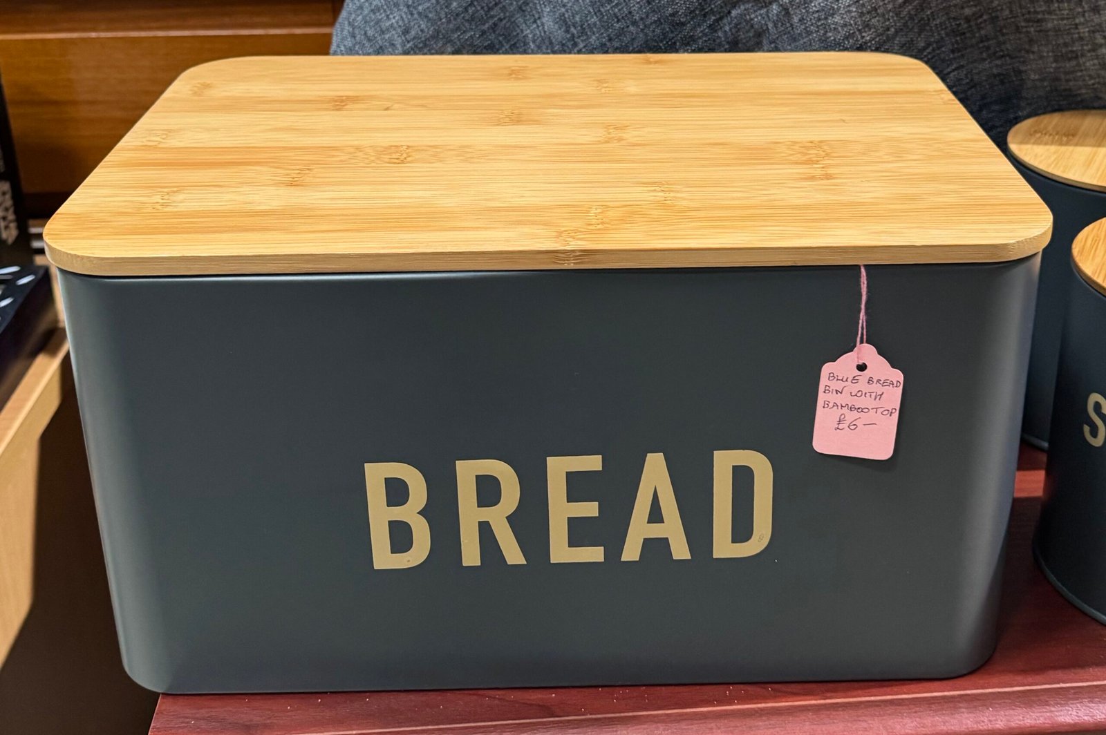 Blue bread bin with bamboo top