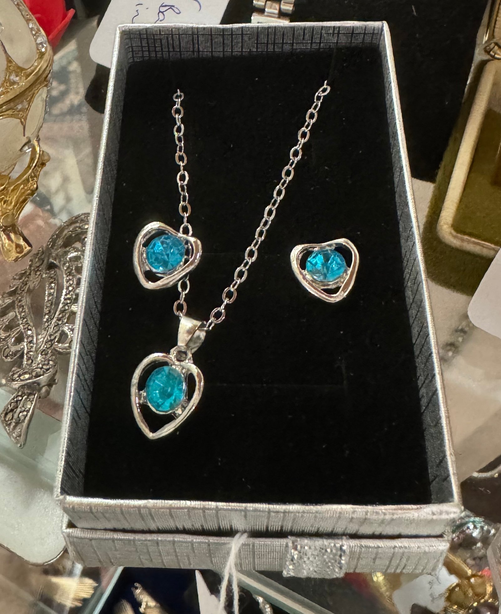 Be the first to review “Boxed silver tone blue earrings and pendant”