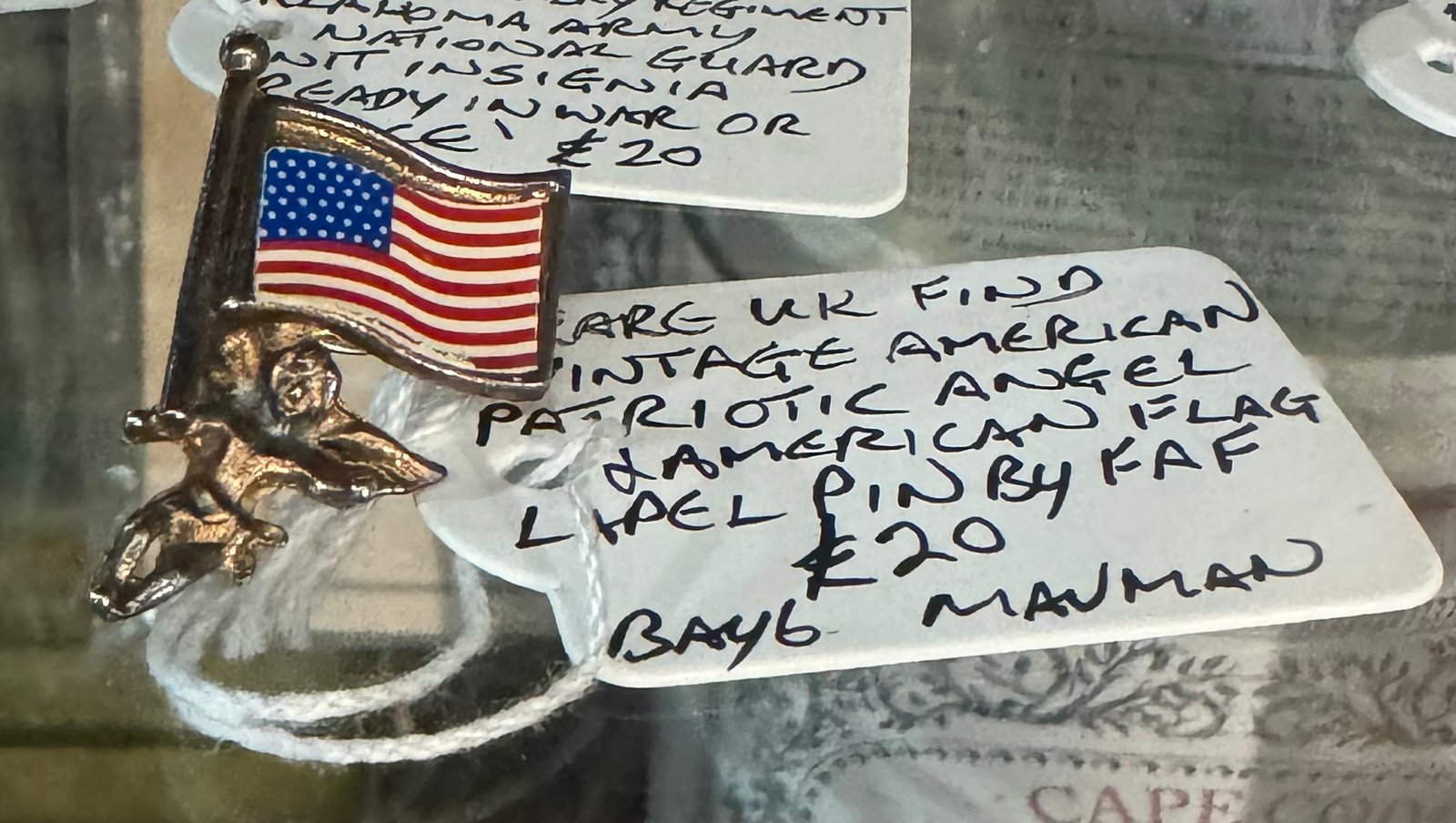 Be the first to review “Rare UK find vintage patriotic angel and American flag lapel pin by FAF”